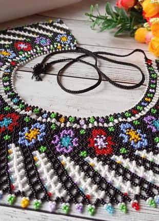 Довжина силянки навколо шиї 37-38см. Ширина силянки-9см. Зав"язки по-30см, ними зручно регулювати довжину. Чеський бісер, міцна нитка.