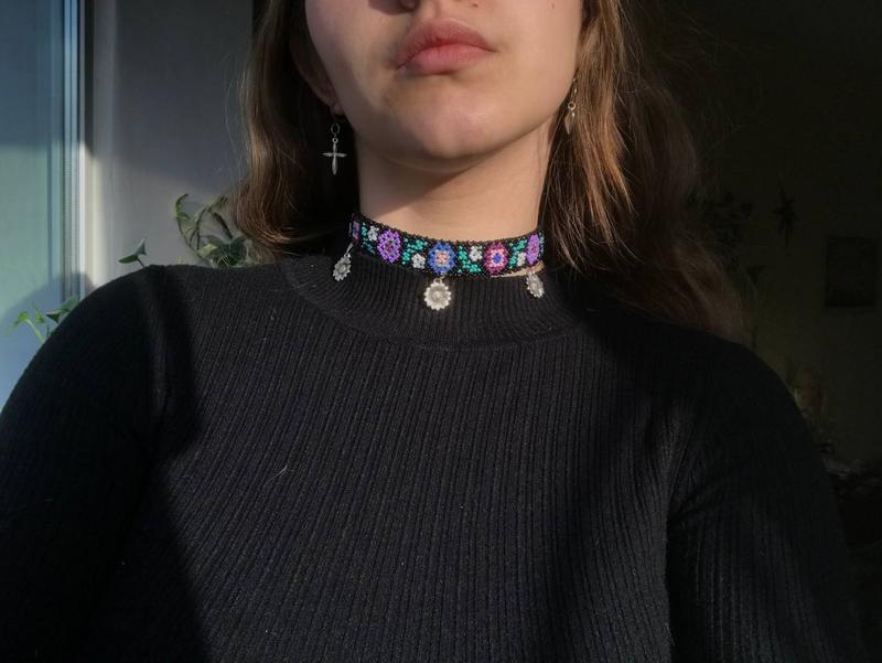 Бісерний гердан в холодних відтінках, з квітковим орнаментом і трьома металевими підвісками соняхами Бісерна основа нашита на оксамитову стрічку, м'яка до тіла і дозволяє бісеру краще зберігатись, мінімізуючи тертя Довжина основи - 30 см Довжина стрічки - 1 м Ширина 2 см Холодне, як перші весняні квіти, що оживають з зимової туги