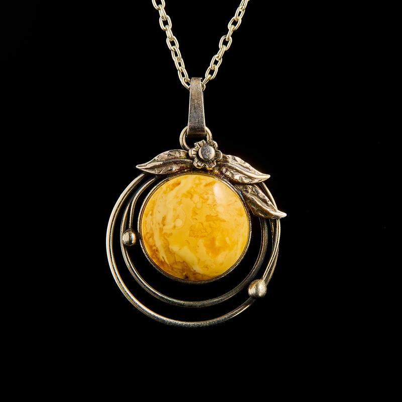 Ожерелье изготовлено в конце прошлого века из янтаря на Вильнюсской фабрике в Литве. Цепочка и каркас кулона изготовлены из мельхиора. Длина цепочки — 64 сантиметра / 26 дюймов. Размеры подвески: 3 x 3 см / 1,2 x 1,2 дюйма. Вес подвески: 9,4 г. Состояние: Без сколов и трещин. Отличное состояние! Оригинальная коробка и этикетка сохранены!