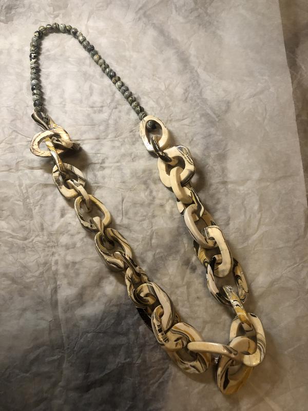 Очень стильное колье-цепоч, в серо-бежево-золотой гамме, очень классно дополнит монохромный минималистичный лук, пластик.