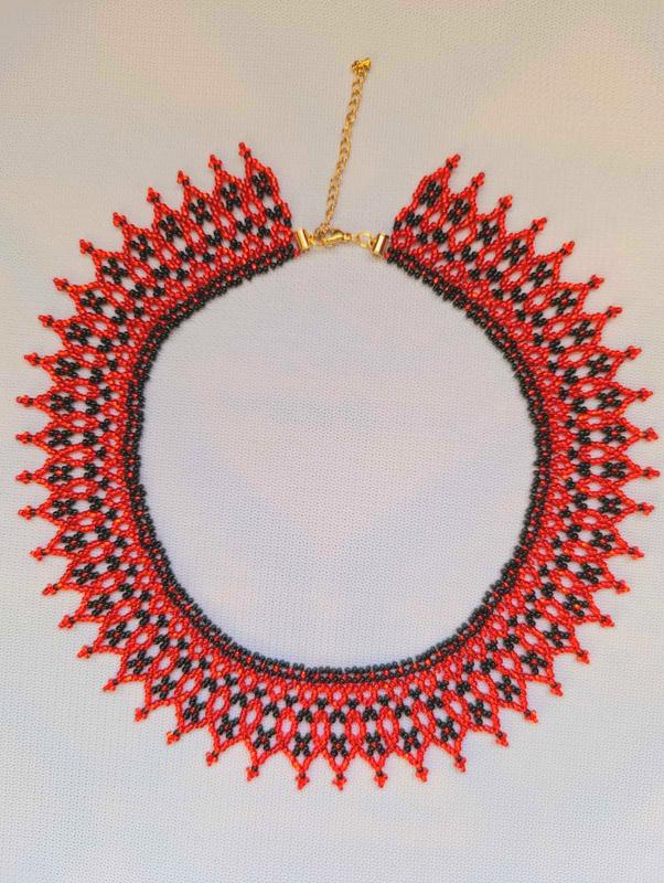 шейное бисерное украшение в виде узкой ленты, выполненной из разноцветных бусин, наниженных на нитяную или волосяную основу, образующих пестрый геометрический, а порой растительный орнамент