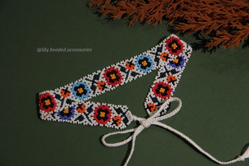 Відтворена однодільна силянка "драбинка" с. Гукливий Воловецького району 20-ті роки ХХ століття. Параметри: довжина бісерного полотна - 29,5 см + зав'язки-косички 21 см кожна; ширина - 2 см; чський бісер; ручна робота