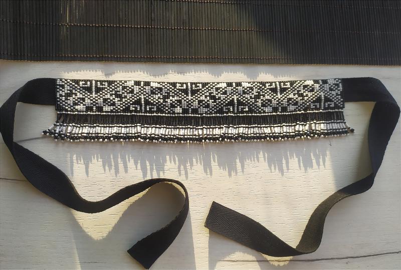 Ґердан з підвісами за мотивами схеми вишивки Чернігівського Полісся з книги "Українські вишиванки" Лідії Бебешко, довжина бісерної частини 28.5см, ширина 3см (з підвісами 6см), довжина стрічки (бавовна) 1м, виготовлений з якісного чеського бісеру Preciosa, + торбинка для зберігання прикраси