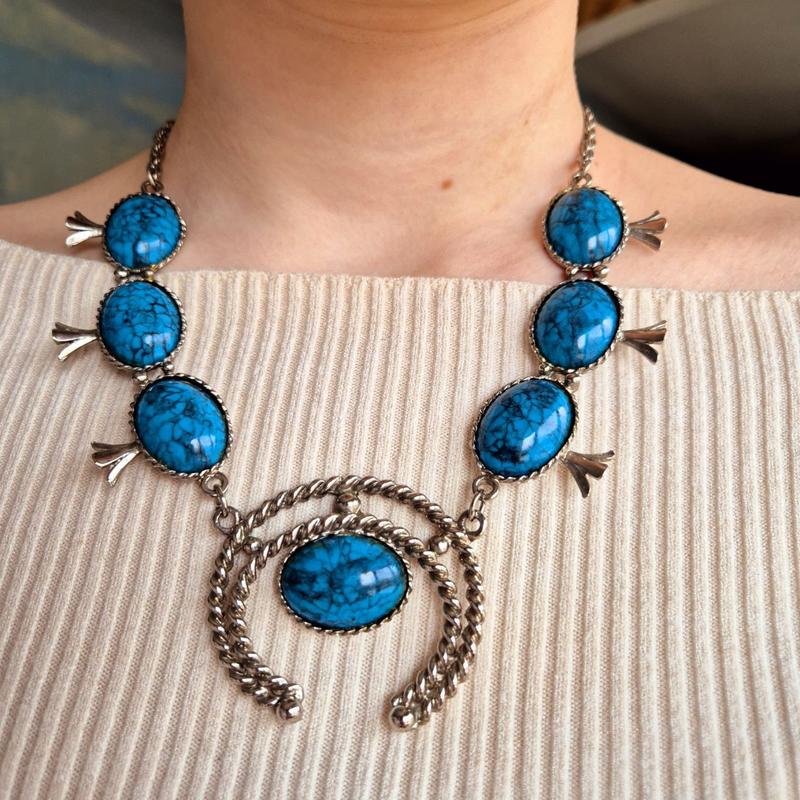 Кольє, штучна бірюза (пластик), 70-80-і роки. Можливо, пізніше. Прикраса без маркування, але стилістикою нагадує американський вінтаж (SARAH COVENTRY) 70-х років. Срібялста онова. Масивна центральна частина з овальними кабошонами, ланцюжок джгут. Застібка шпрингель. Стан добрий. Довжина - 76 см. Як на мене, задовге, і краще виглядає у скороченому вигляді (на останньому фото).