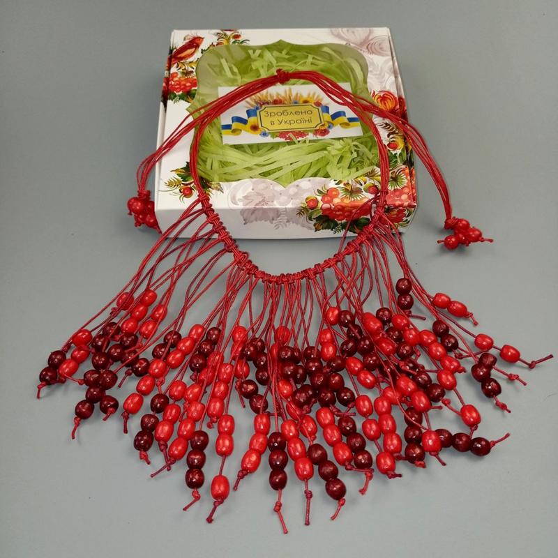Це намисто ручної роботи виготовлене із натурального карпатського бука та мотузки, втілюючи багаті традиції українських народних прикрас. Розмір універсальний. Букове дерево відоме своїми магічними та цілющими властивостями. Вважається, що воно приносить силу, захист та гармонію власнику. Кожна намистина акуратно нанизується вручну, створюючи унікальний автентичний шматочок української спадщини. Таке намисто ідеально підходить для будь-якого вбрання, для культурних заходів, весіль або як подарунок. Поставляється в красиво оформленій подарунковій коробці, тому може бути готовим подарунком. Виготовлено з любов'ю в Україні💙💛