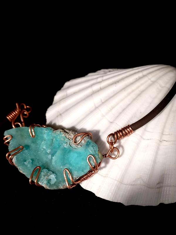 Прикраса ручної роботи з натуральним небесним геміморфітом на каучуковій основі. Камінь має мідні обрамлення, мідну застібку