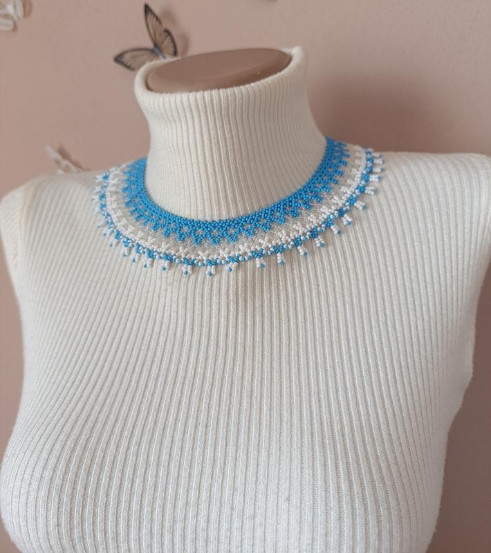 Силка изготовлена из чешского бисера в технике нанизки. Ширина ожерелья около 4 см, длина ожерелья +-40 см плюс цепочка продлитель на 5 см