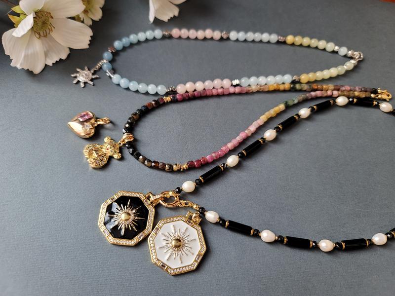 Кольє з чорного агату, натуральних річних перлин та шпинелі. Фурнітура 18к, кулон знімається. Кулон може бути чорний або білий. Довжина 42 см.