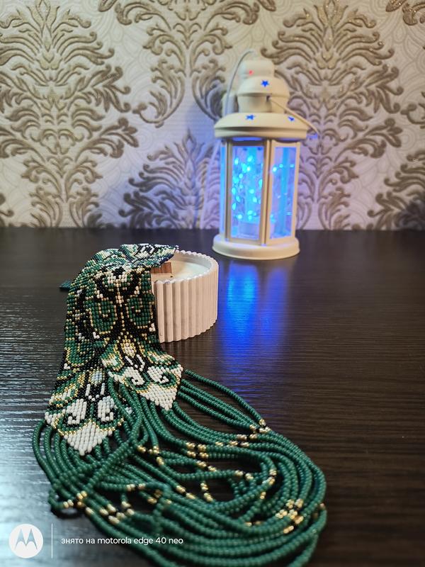 Гердан. поєднання насиченого зеленого із білим та вкрапленнями золотого.