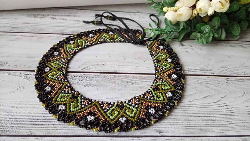 Довжина силянки навколо шиї-38см. Зав"язки по-30см, ними зручно регулювати довжину. Ширина силянки -3,5см. Чеський бісер, міцна нитка.