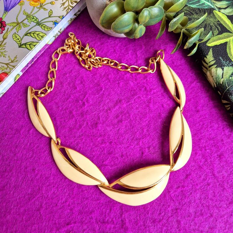 Цей чокер TRIFARI (80-90-і роки) чудовий, але має ваду. На основному литому металевому декорі з емаллю є тріщини на сплаві. Як на мене, при досить уважному і бережливому ставленні кольє можна носити ще не один рік. Сама по собі прикраса дуже гарна, виразна, з бежевою емалі. Конструкція чокера - на гачку. Доданий відеоогляд.