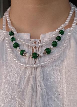 Намисто тришарове з білих бусин та з натуральних каменів (малахіт та ховліт)