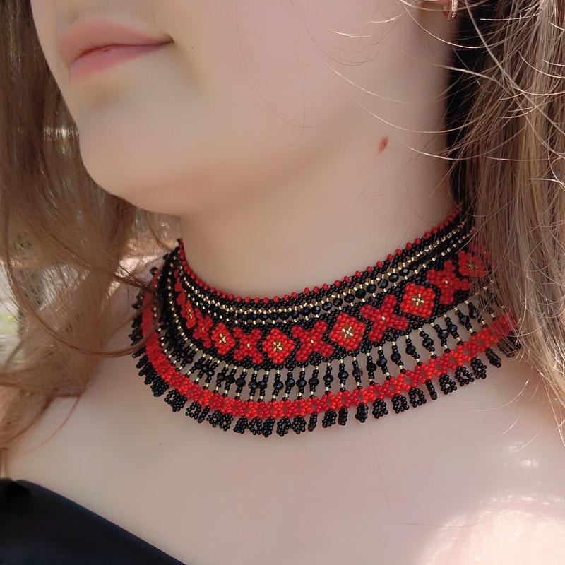 Эта роскошная силянка, выполненная в традиционной красно-черной гамме, вдохновлен украинским орнаментом. Тщательно сплетенная вручную из качественного чешского бисера, подчеркнет вашу индивидуальность и напомнит о глубоких корнях культуры. Идеально подходит к этнообразу, праздничным событиям или как стильный акцент в современном наряде. Размеры: Ширина -6 см. Длина - 34 см, регулируется завязками, длина которых по 30 см + 5 см кисточки. Материалы: Чешский бисер, хрустальные бусины. Нитка.