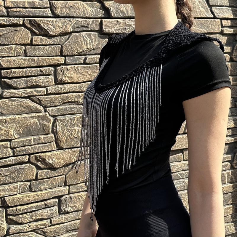 Унікальна в’язана прикраса з бахромою із бісеру 😍 Легка, стильна, з ефектним силуетом — ідеальна для фотосесій, виступів і просто вау-луків 🔥 🖤 Ручна робота 🧶 М’яка пряжа + бісер (кольори питайте в наявності) 📏 Універсальний розмір 🎨 Можна на замовлення в іншому кольорі і у іншому дизайн (з рукавами або без), також можна замовити такий виріб на будь-яку частину тіла)