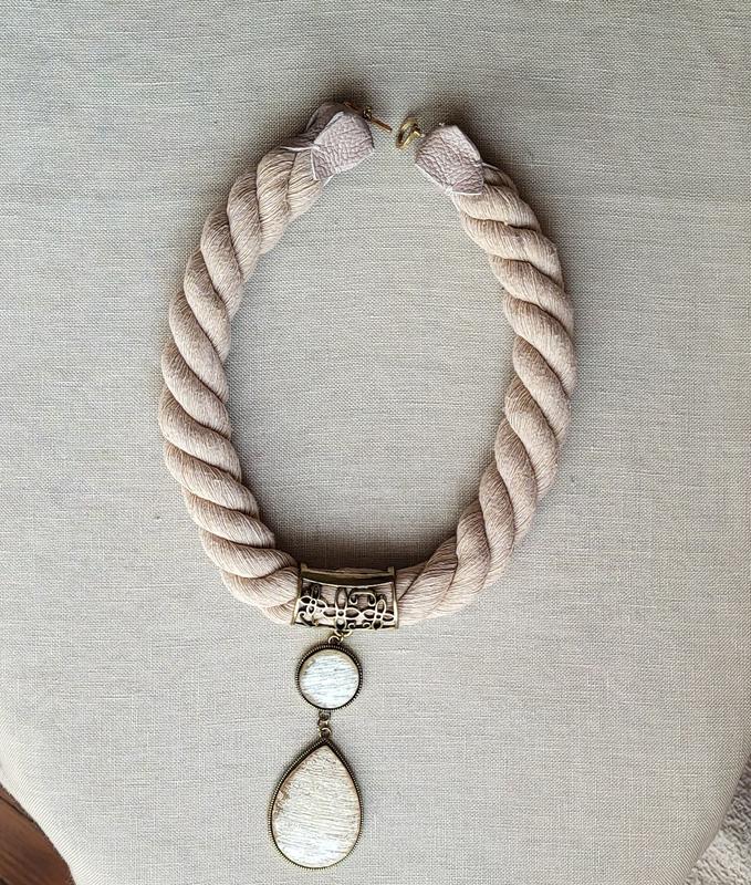 моя доробка. Вона вражає масштабом:)) До мене потрапив лише кулон. Діаметр для вставки був дуже великий і я вирішила , що саме канат підійде чудово. Сподіваюсь, вам теж сподобається. Кулон сучасний, вставки акрил. Чудова кольорова гамма - акрил солом'яного відтінку, метал кольору бронзи . На шиї виглядає масивно. Канат м'який. Ковпачки для застібки я зробила з натуральної шкіри, застібка тогл. Прикраса точно не залишить нікого байдужим. Висота кулону 9.5см, ширина внизу 3.5см. Довжина канату 49 см. Діаметр канату 2.5см.