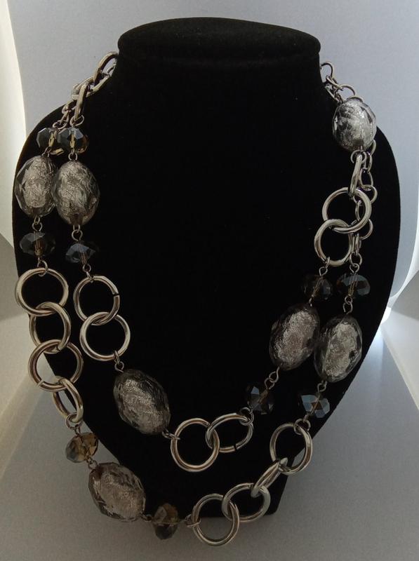 Женское винтажное колье американской компании Cookie Lee, 80-е годы 20 века. Украшение выполнено из ювелирного сплава серебряного цвета. Вставки пластик с наполнителем серебряного цвета и наместины-рондель цвета шампань. Длина 100 см. Колье очень стильное, выглядит современно, подойдет под любимую одежду.