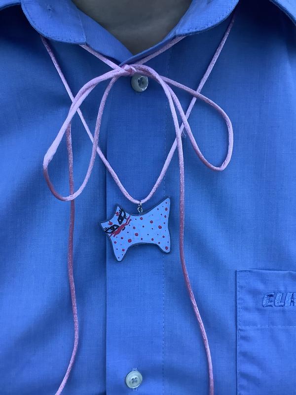 Прикраса на шию «Котик» ПРИКРАСА - ДВОХСТОРОННЯ Прикраса виконана вручну з глини. Також є фурнітура зі сталі. Розписана акриловими фарбами та покрита глянцевим лаком, який захистить від потрапляння води у прикрасу. Розміри: Ширина: 4,4 см Довжина: 3,3 см Товщина: 0,2 см Також разом з прикрасою йде замшевий/ атласний шнур (2метри).