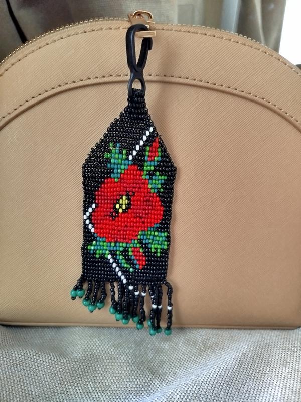 Це яскрава та оригінальна прикраса з бісеру у вигляді брелока або підвіски. Виріб виконаний у формі видовженого ромба з чорного бісеру, який слугує фоном для яскравого зображення червоного мака з зеленим листям. Квітка майстерно виготовлена з дрібного бісеру червоного, жовтого та зеленого кольорів, з тонкими білими лініями, що додають композиції виразності. У нижній частині прикраси розміщені бісерні нитки з пензликами — чорні з вкрапленнями білих і зелених намистинок. Верх прикраси оснащений пластиковим гачком, що дозволяє зручно прикріпити її до сумки, рюкзака або ключів. Цей виріб поєднує в собі традиційні українські мотиви та сучасний стиль, додаючи образу яскравого етнічного акценту.