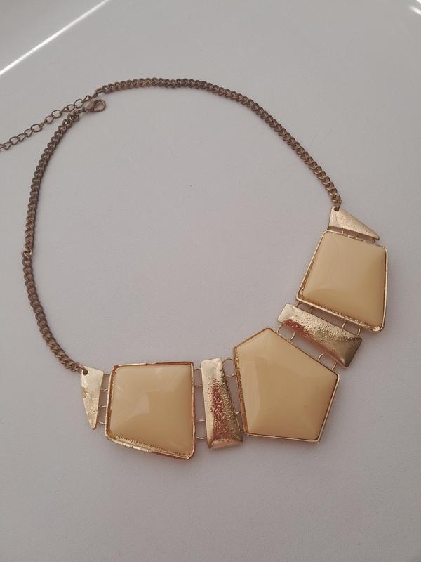 Кольє з великими деталями блідо-жовтого кольору(пластик під емаль) та металом золотого кольору. Сама велика середня деталь розміром 5см х 4,7см. Довжина лвнцюжка регулюється. Нова або Укрпошта