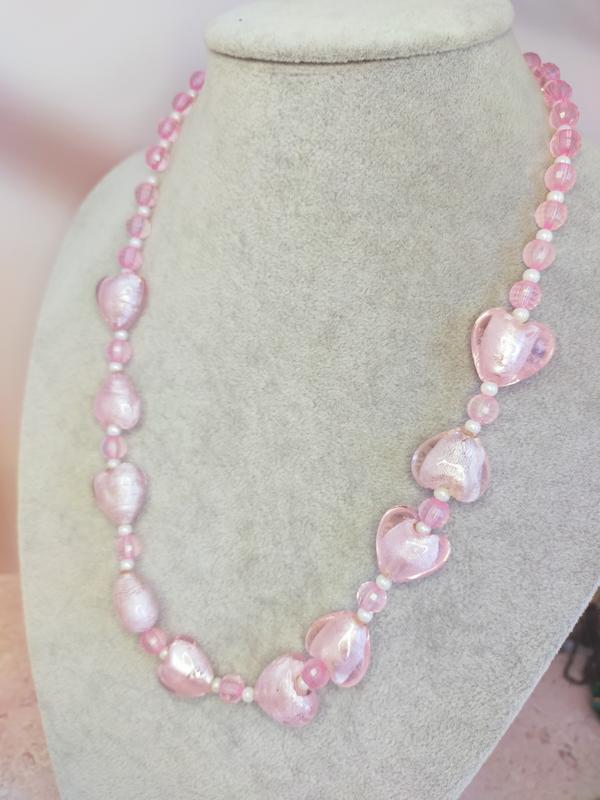 Кольє з рожевими скляними серцями.Маленькі намистини-акрилові Довжина-59см .
