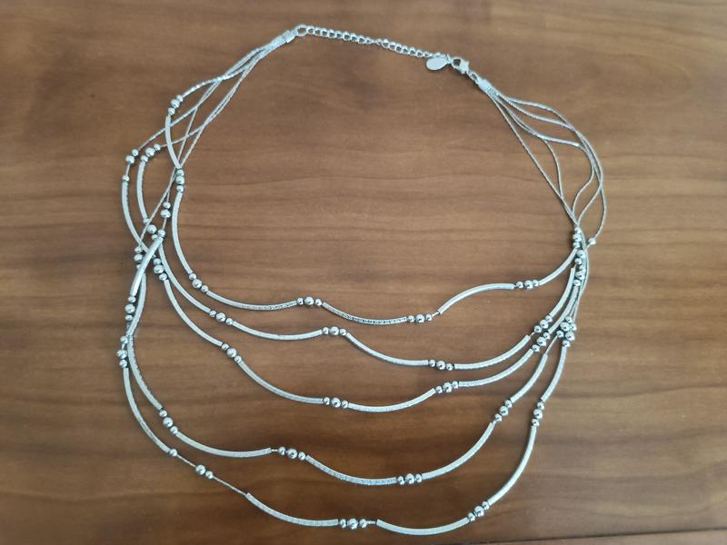 Елегантне кольє з Англії Довжина: 44 см + 7 см регульований ланцюжок ⠀ Багатошарове кольє з вигнутими сріблястими сегментами та дрібними намистинами, що створюють каскадний ефект. Витончений дизайн підкреслює шию та додає образу шарму. Ідеально пасує як до вечірнього вбрання, так і до стриманого повсякденного стилю. ⠀ 🔹 Привезено з Англії 🔹 Зручна застібка-карабін 🔹 Регульована довжина для комфортної посадки 🔹 Відмінний стан ⠀