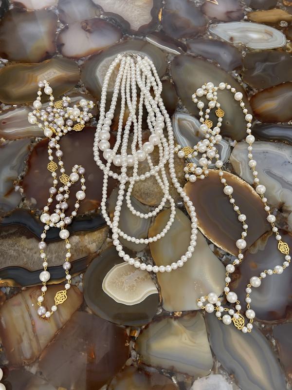 Кольє перлини довге, можливо замовити як сет з двох , або трьох( або більше) різних. Кожне кольє продається окремо! Сет з двох 1200; сет з трьох 1500 грн. Є три варіанти : білий з золотом, білий та сірий з золотом та намисто в пʼять рядів . Дивиться та вибирайте🌸