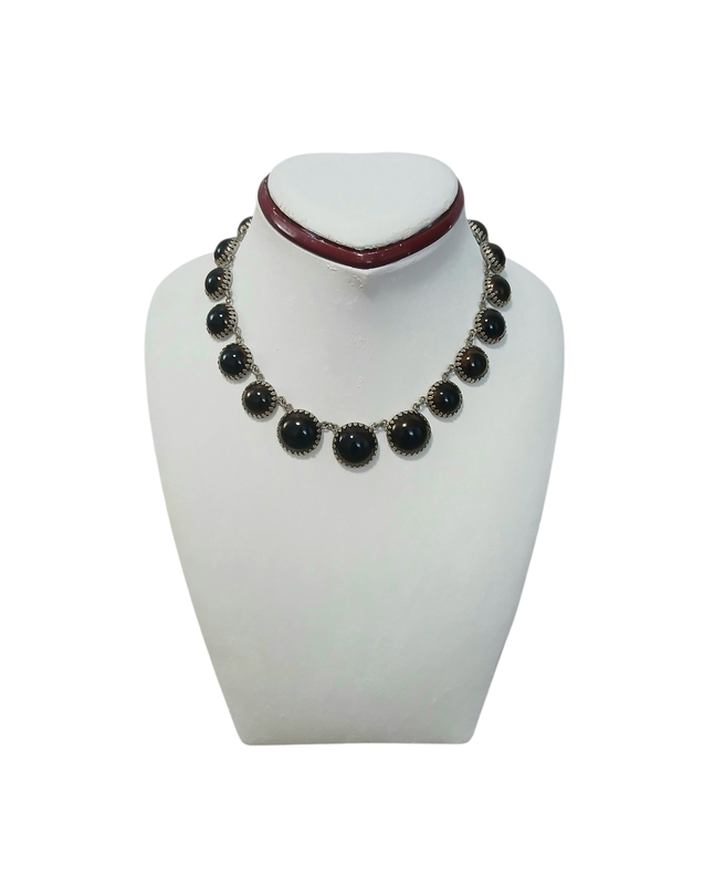 Кольє з чорним склом з золотисто - мідним відливом взяте у фігурні крапани характерними для прикрас Австрії. Вінтаж. Довжина - 36,5 см, діаметр найбільшого кабошона з оправою - 1,9 см.