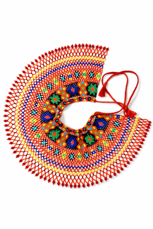 Криза з бісеру з геометричним орнаментом ручної роботи Яскрава етнічна криза, створена вручну з якісного бісеру, поєднує в собі насичені кольори та традиційні геометричні візерунки. Виріб має розкішну напівкруглу форму з ажурною сіткою по краю та декоративними підвісками, що додають образу легкості й динаміки. Завдяки зав’язкам із китицями довжина легко регулюється, забезпечуючи комфортну посадку. Криза стане стильним акцентом до вишиванки, сукні або однотонного вбрання, підкреслюючи індивідуальність і любов до етнічної естетики. Характеристики: Матеріал: чеський бісер Техніка: ручне плетіння Стиль: етно, бохо Тип застібки: зав’язки Унікальний авторський виріб вага 220 грамів ширина 17 см довжина по внутрішньому краю 36 см