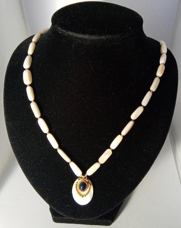 Кольє з білого перламутру. Фурнітура зроблена з ювелірного сплаву золотого кольору. Центральний підвіс оздоблений кобашоном синього колльору. Довжина прикраси 55 см.