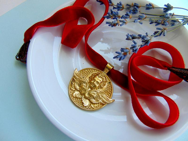 Підвіска з рельєфним обличчям ангела — це відлуння старовинних оберегів, що носили на грудях як символ духовного захисту. Оксамитова стрічка — як знак шляхетності. Ця прикраса — поєднання сакрального й естетичного.Ручна робота. Матеріал: латунь Розмір:4см*3,5см Довжина стрічки:70см