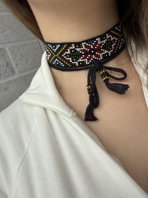 Гердан чокер з бісеру на завʼязках з бісерними кінцевиками Довжина бісерного полотна 28см, ширина 3см Довжина завʼязок 36см, через що підійде на будь-який розмір шиї Ручна робота з каліброваного чеського бісеру