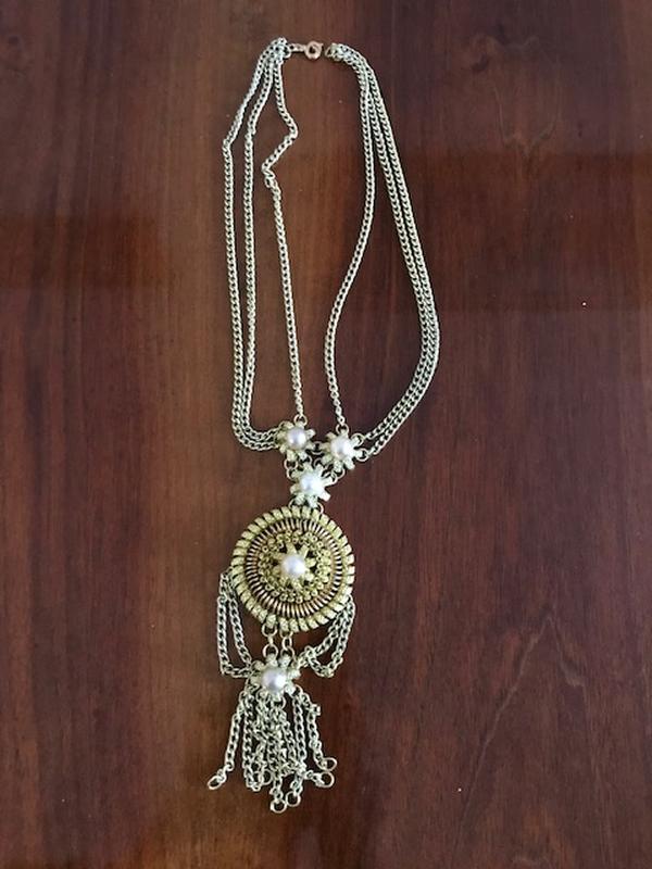Винтажное женское украшение на шею, выполненное из большого количества цепочек. Кулон оригинальной работы, украшен перлами. Длина изделия 37 см, длина цепочек без кулона 23 см.Один цепочка порованая.