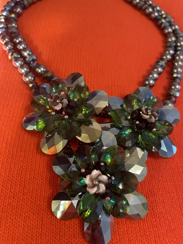Вінтажне унікальне кольє відомого англійського бренду біжутерії Butler and Wilson Green Borealis Floral: Кристали та штучні перли. На торговельних майданчиках ціна стартує від 100 доларів. Виглядає чудово(фото не передає). Стан ідеальний.