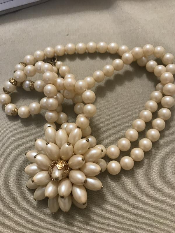 Дуже гарний стильний сотуар старий вінтаж намистини пластик, але якість гарна довжина намиста 76; діаметр квітки 4,5 см , вага середня колір топленого молока. Заходьте на сторінку, пропоную багато прикрас та аксесуарів відмінної якості, Прикраси вінтажні та сучасні на любий смак . Оплата на карту , відправляю любою поштою .