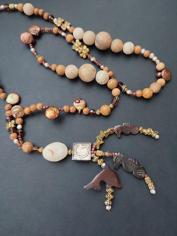 Вінтажне намисто буси (чотки мала) з пісчаної яшми, перлів, дерева, насіння, і агату
