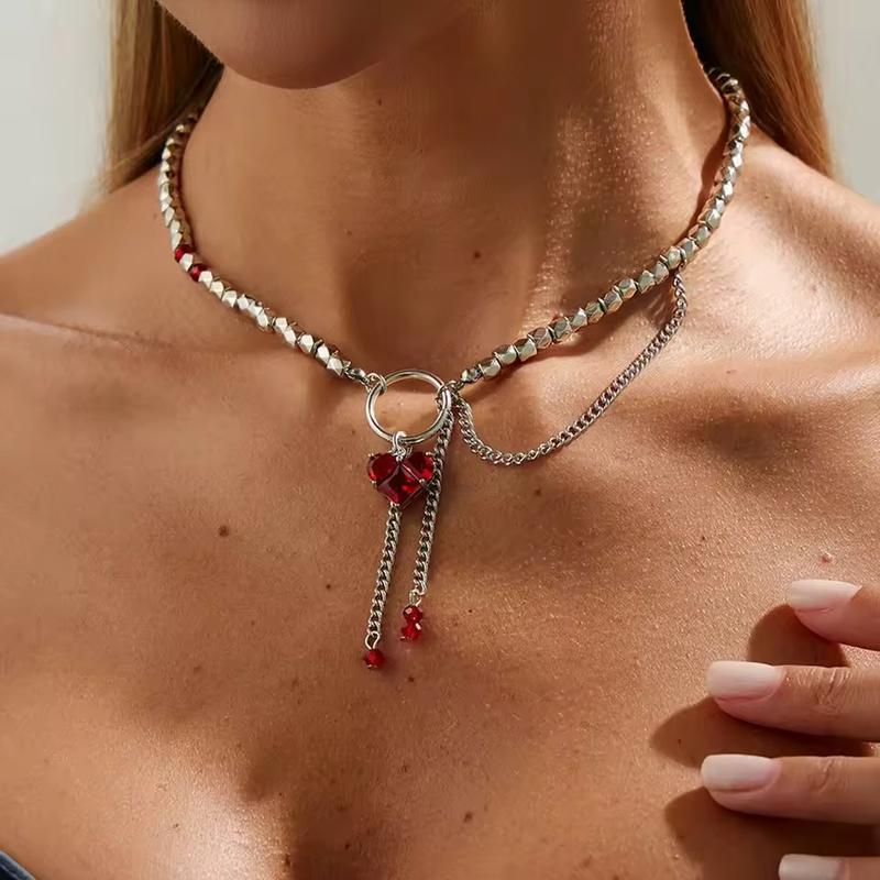 Акція! БЕЗКОШТОВНА ДОСТАВКА на замовлення біжутерії на суму від 1000 грн. (До відділення пошти або поштомат) Акція діє при оплаті на реквізити Стильна прикраса на шию виконана з дрібних сріблястих геометричних намистин і доповнена центральним металевим кільцем, до якого кріпляться дві підвіски-ланцюжки з яскравими червоними кристалами-серцями та намистинами на кінці. Асиметрично розташований додатковий ланцюжок створює ефект багатошаровості, а щільна посадка уздовж ключиць красиво підкреслює шию та зону декольте, роблячи прикрасу виразним акцентом як для вечірніх виходів, так і для стильних повсякденних образів.