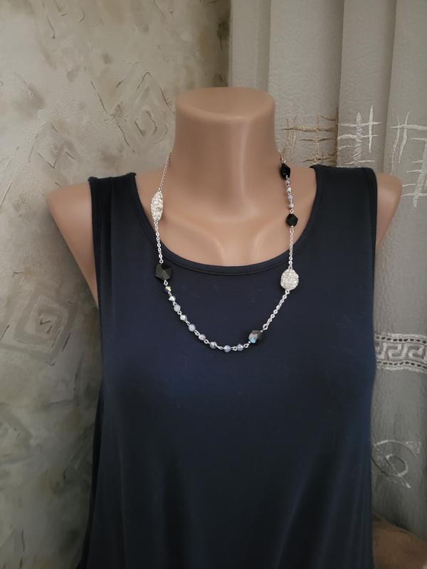 Кольє Swarovski з кристалами блакитного, сірого і прозорого кольорів, а також вставками зі сріблястого металу. У коробці. Довжина - 58 см з можливістю подовження до 65 см. До них є сережки-пусети і кліпси (фото) - продаються окремо.