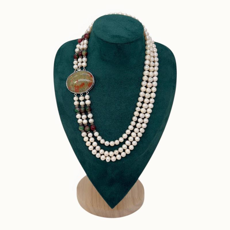 Перлинне кольє у три ряди - справжня позачасова елегантність. Натуральні перли м’яко лягають на шию, створюючи багатошаровий акцент, а застібка з натуральної яшми перетворює прикрасу на справжній арт-об’єкт. ▫️ Натуральні перли ▫️ застібка з натуральною яшмою ▫️ Довжина: 47 / 50 / 53 см ▫️ Вага: 121 г