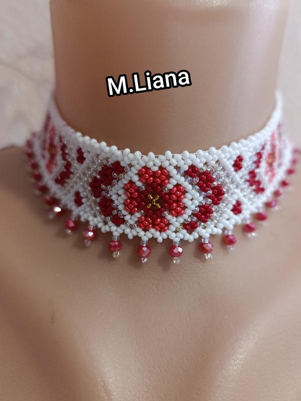 Пропоную ексклюзивну прикрасу-комір, виготовлену в традиційній техніці низання. Силянка має витончені підвіски («сльозки»), які грайливо рухаються під час ходьби, додаючи образу динаміки. Характеристики: Матеріали: високоякісний чеський бісер (Preciosa), міцна ювелірна нитка. Колір: класичне тріо (білий, червоний, прозорий) із золотистими акцентами в центрі квітів. Застібка: регульована (підійде на будь-який обхват шиї).