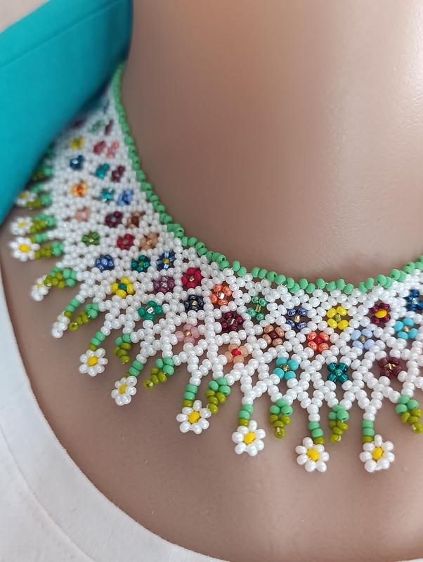 Легка та ніжна силянка з білою основою і різнобарвними вкрапленнями, доповнена підвісками-ромашками. Створює відчуття свіжості, літа й природної гармонії. Ідеальний акцент для світлого, жіночного образу 🌼