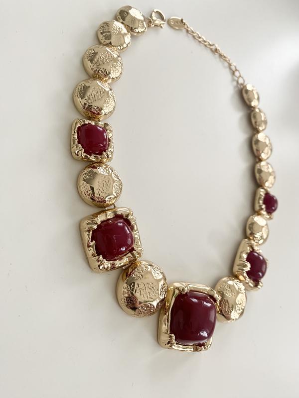 Вишукане кольє Mango Біжутерний сплав в золотому тоні, "м'яте золото", кабошони непрозорого темно-вишневого кольору Довжина з подовжувачем 46 см , розмір центрального елементу - 3*3 см Стан нового Маркування присутнє