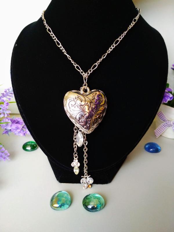Кольє з сердечком і підвіскою з камінчик. На підвісці відсутній один камінчик. Довжина: 73,5 див.