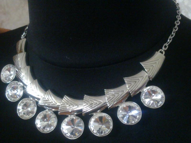 Шикарне, оригінальне кольє. прикрашене великими, прозорими стразами, з кришталю, дрібної, конусоподібної огранювання в якісному, блискучому металі, під срібло(не змінює колір і блиск). Ланки ланцюжка збільшені і мають гарне рефление. Загальна довжина кольє=38,5 см, є подовжувач до 48 см, висота кольє=2см. Виготовлено в Туреччині, стрази з якісного кришталю, мають красивий, мерехтливий блиск. Рекомендую. як стильне. якісне прикраса!