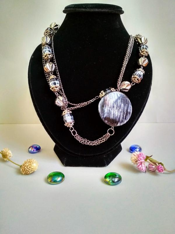 Стильні намисто з пластиковими вставками. Прикраса має застібку карабін і ланцюжок для регулювання ширини. Довжина в застебнутому вигляді: 50 см довжина: 100 см