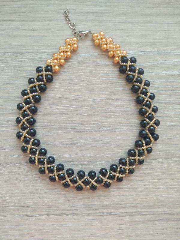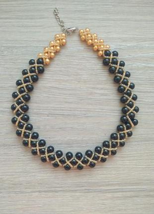 Это колье станет отличным дополнением к вашему вечернему или сценическому образу. Выполнено оно из бусин черного цвета и золотистого бисера. Длина изделия 42 см, ширина 2 см, вес 66 гр.