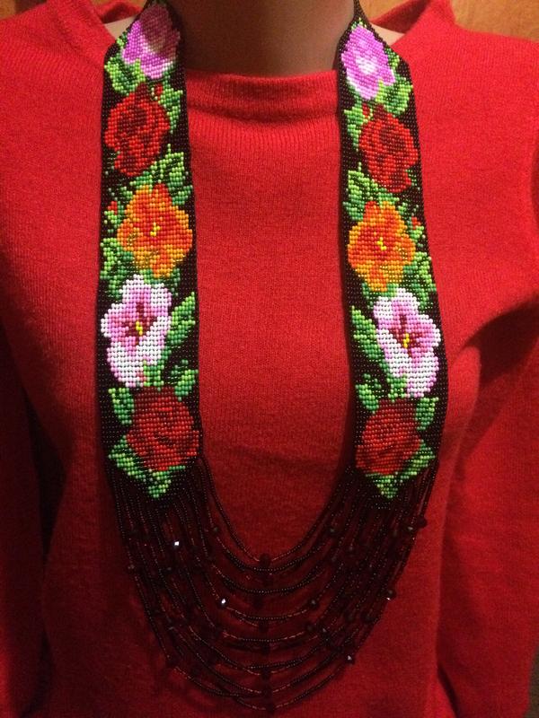 Виготовлений з чеського бісеру та міцної нитки. Довжина виробу складеного навпіл 51см, ширина смужок 4.5 див. На замовлення 5 днів.