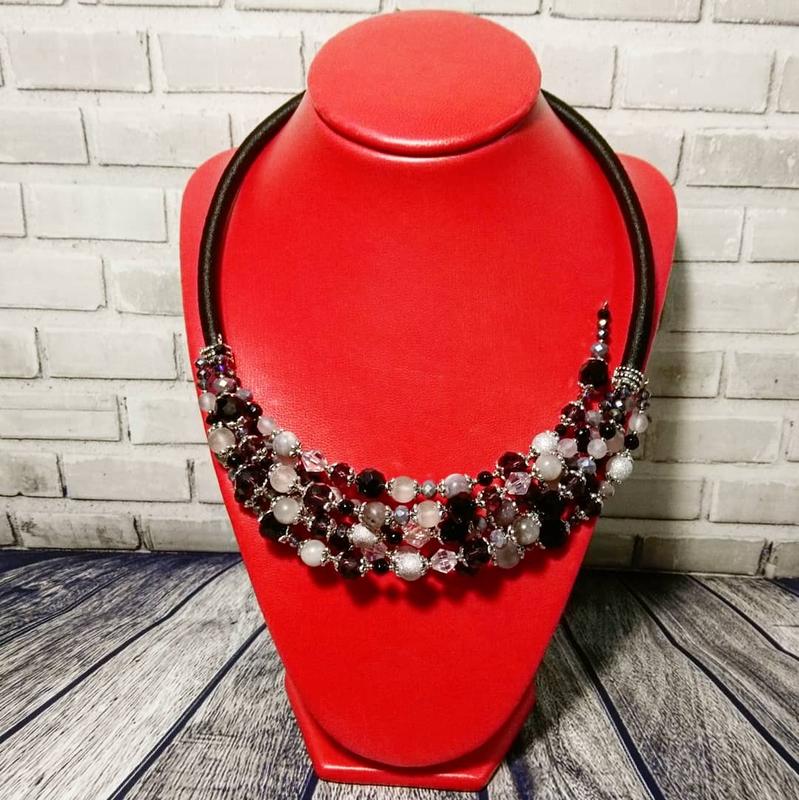 Кольє ручної роботи чудово підійде як під плаття так і під блузу. Виготовлене з кришталевих намистин з вкрапленнями натурального каміння - турмаліну. При попаданні на нього сонячного світла гарно виблискує та переливається. Під замовлення можу зробити в інших кольорах. В наявності