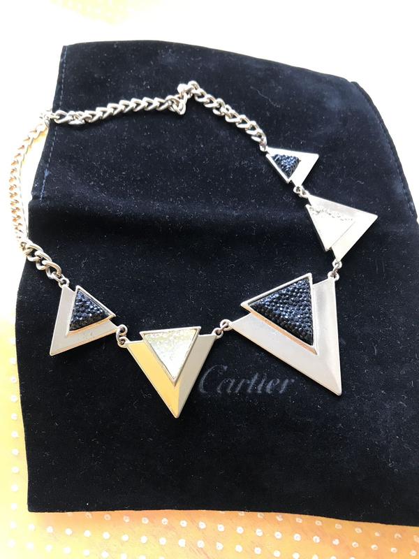 Святкова прикраса у вигляді трикутників. Оригинальнально виглядає в своєму виконанні. Природний жовтий метал на якому вставки мерехтливих пластин. Одягала пару раз під вечірнє вбрання і під білу сорочку. Прикрас своїх багато, хочу поділитися з вами)). Довжина прикраси 45 см, ширина великого трикутника (посередині) 4см.