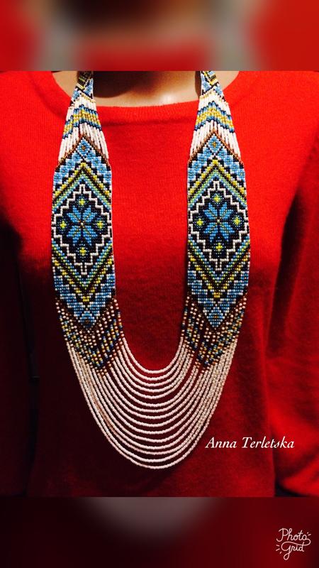 Красивий гердан виготовлений з чеського бісеру, в національних кольорах. Довжина виробу 50см,ширина полосок4,5см.