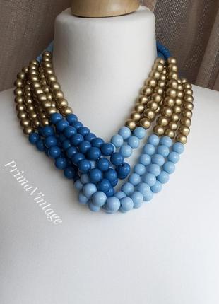 Вінтажні намисто з пластику, 70-80-ті. Зібрані з намистин 3 кольорів: темно-бірюзовий, світло-жовтий, золотавий. Довжина 50см+6см подовжувальна ланцюжок. Вельми цікавий дизайн (низькі перекинуті один через одного), гарне поєднання кольорів. Важный момент! Я всегда фотографирую при дневном освещении, без вспышки и сторонних приложений, но, тем не менее, на моём гаджете цвета слишком уходят в голубой! Бусины темнее, не такие ярко-голубые, с добавлением в бирюзу капельки зеленцы. Наиболее приближенные цвета на фото с манекеном (44 размера). Есть цвета, которые всегда искажает камера. Это один из них. Состояние: очень хорошее винтажное состояние. Возле застёжки видны нитки белые, см.фото. Металлические элементы потемнели. Маркировка: нет.